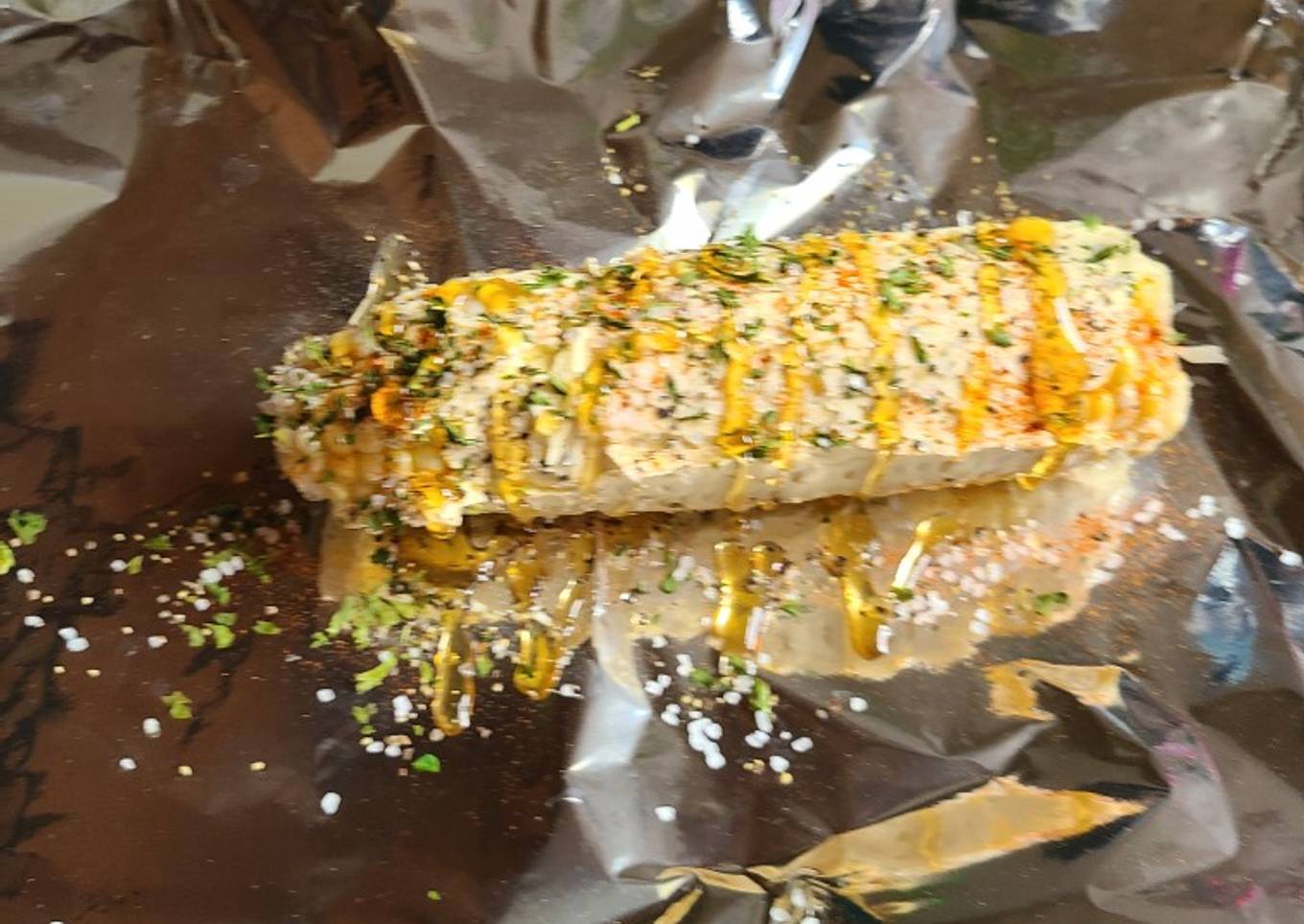 - Sprinkle on each seasoning to liking then drizzle on honey then roll corn on other side and repeat and roll up in foil