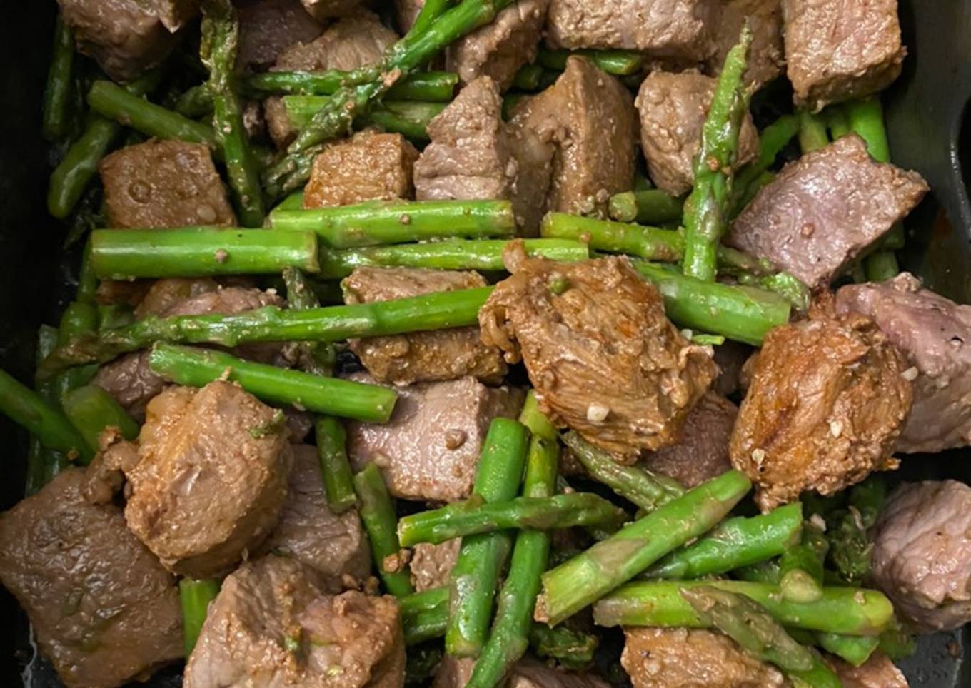 - Season steak bites with dry ingredients no olive oil then season the asparagus the same as the steak bites with olive oil