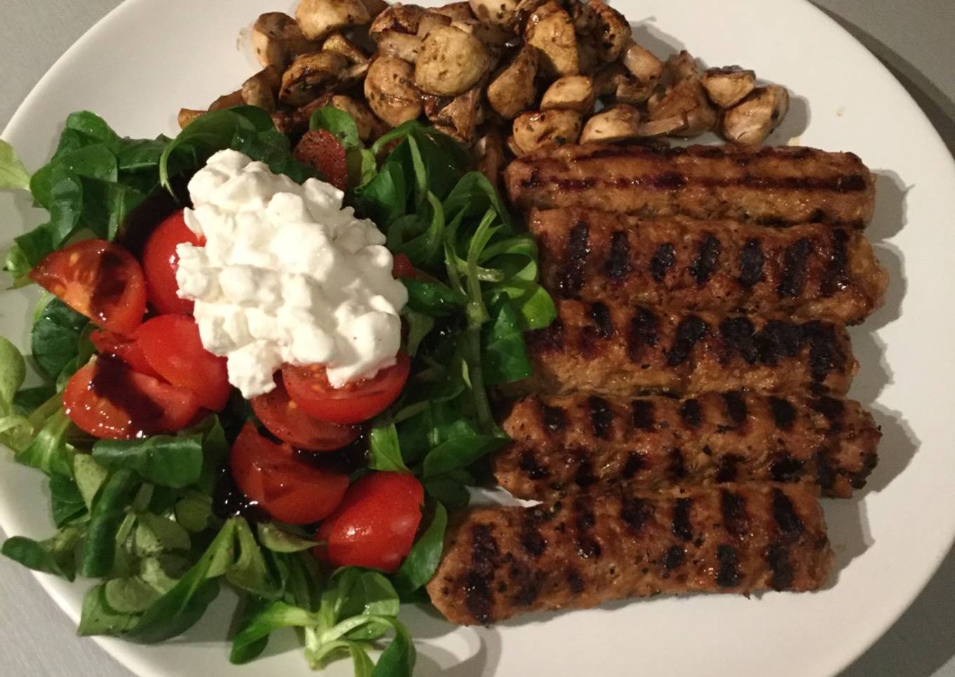 - Wash the mushrooms and cut them into 4 pieces and place them on the grill and wait 5-10 min until they are ready. Then sprinkle with salt & pepper,dried oregano and add a tbsp of balsamic vinegar and mix.