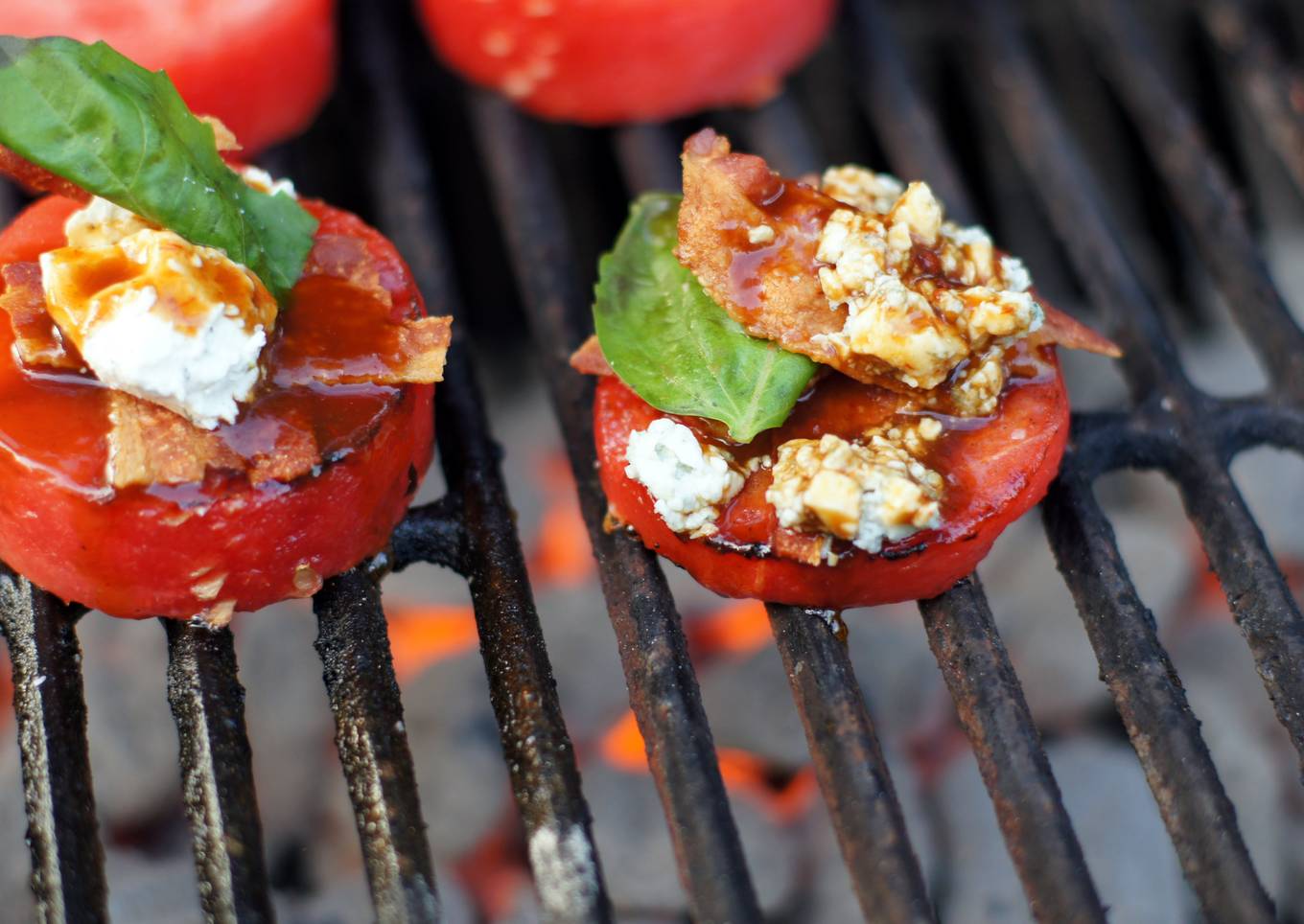 - Transfer the grilled rounds to a serving plate; top with bacon, blue cheese crumbles, and fresh basil. Drizzle watermelon rounds with Carolina Joe's grillin' sauce, or your preferred barbecue sauce and serve immediately