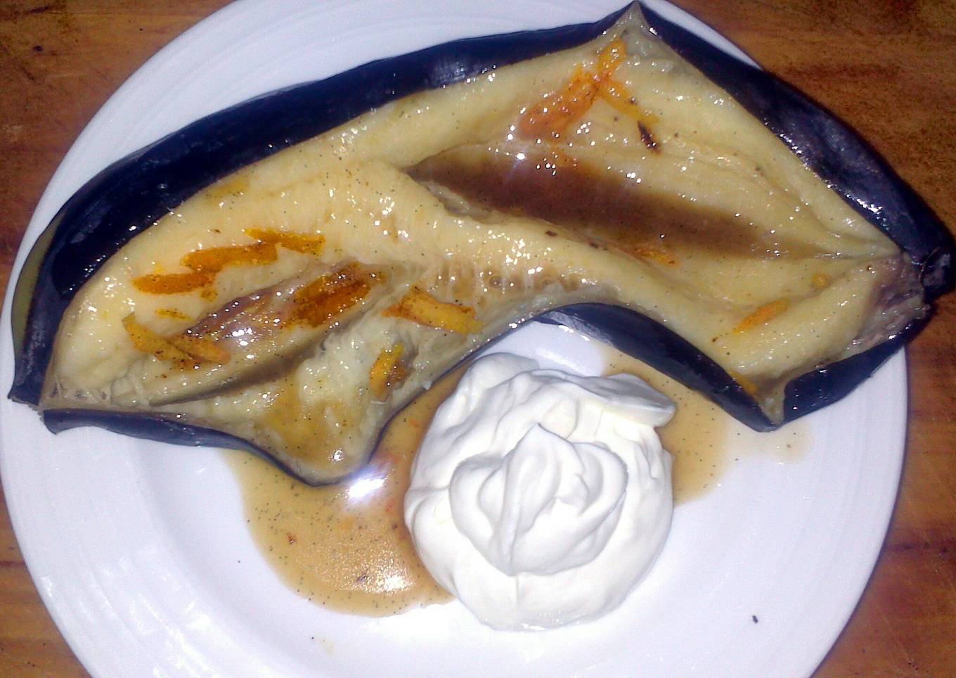 - Use a sharp knife and cut the skin of each banana lengthwise and spoon in some paste .serve straight away witha spoonful of mascarpone or creme fraiche.