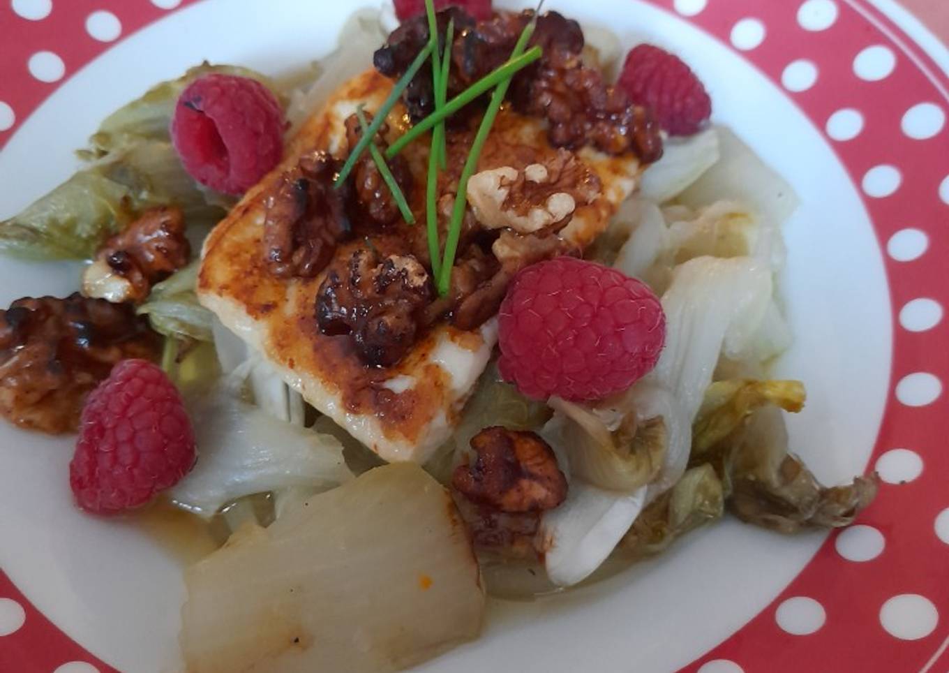 - Put the chicory in a deep platter put on the cheese. Put on the nuts and the sauce. Garnish with the raspsberries